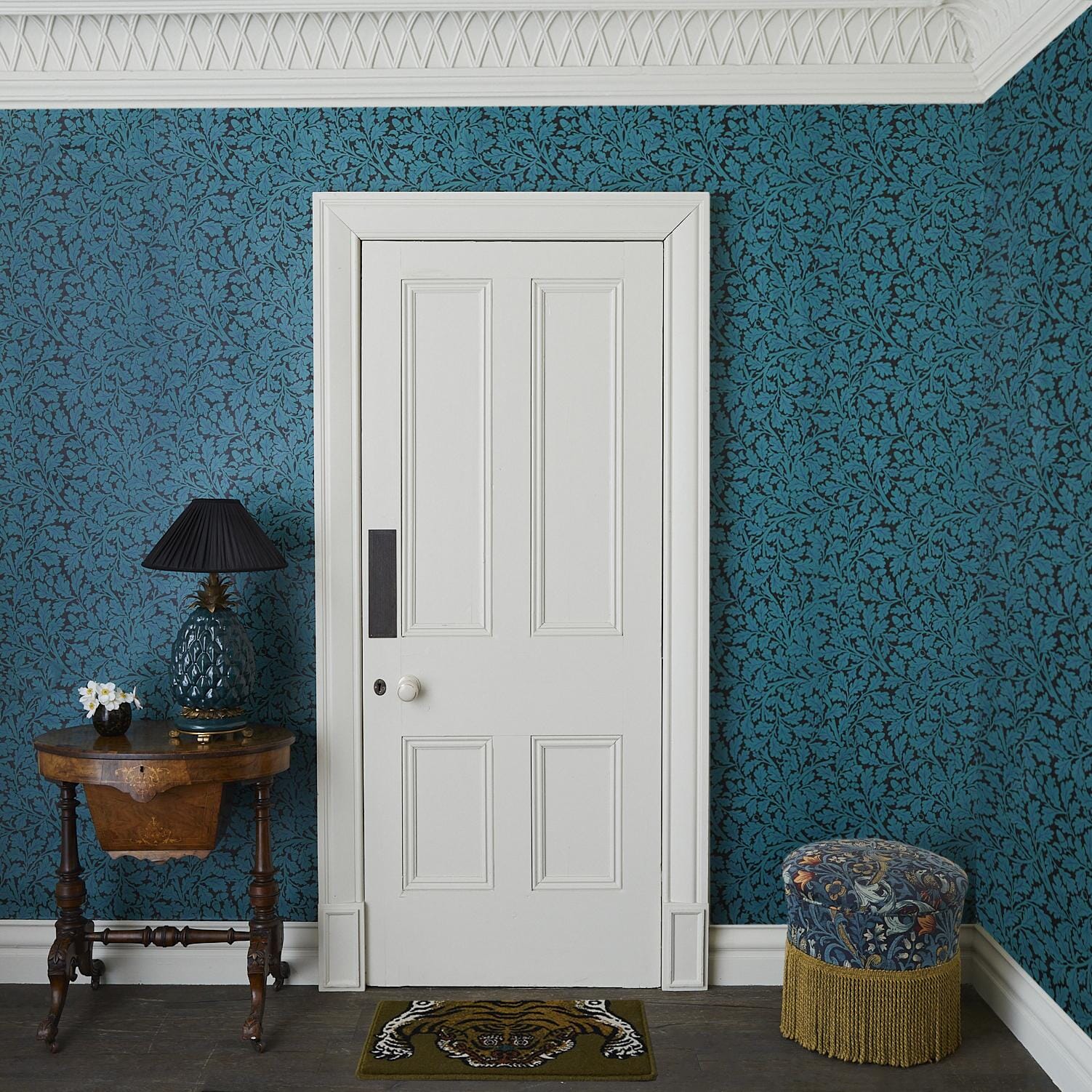 A bold tiger-inspired doormat woven in warm khaki wool, drawing from traditional Tibetan tiger rug designs. Intricate animal motif captures a wild, elegant aesthetic with layered brown, cream, gold, and green tones. Crafted using premium wool with a distinctive textured pattern and whipped edge, this doormat adds a statement touch to entryways and hallways. Perfect for introducing a touch of exotic, artisanal character to your home's threshold.